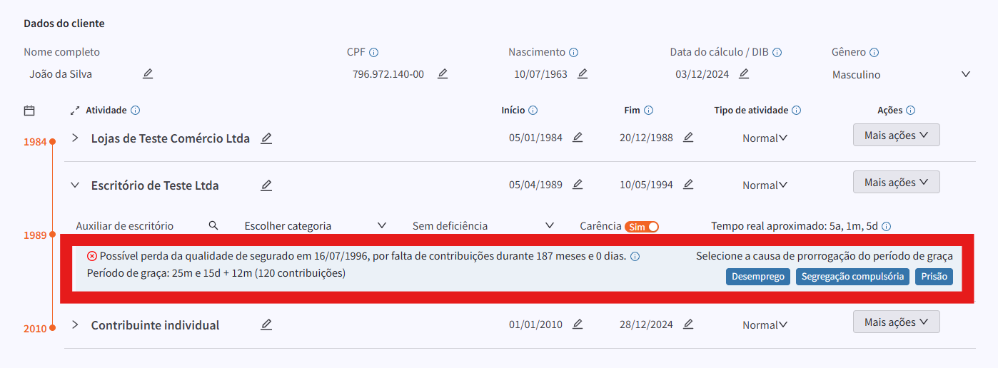 As informações sobre Qualidade de Segurado, inclusive com as possíveis causas de prorrogação, são demonstradas dentro dos vínculos.