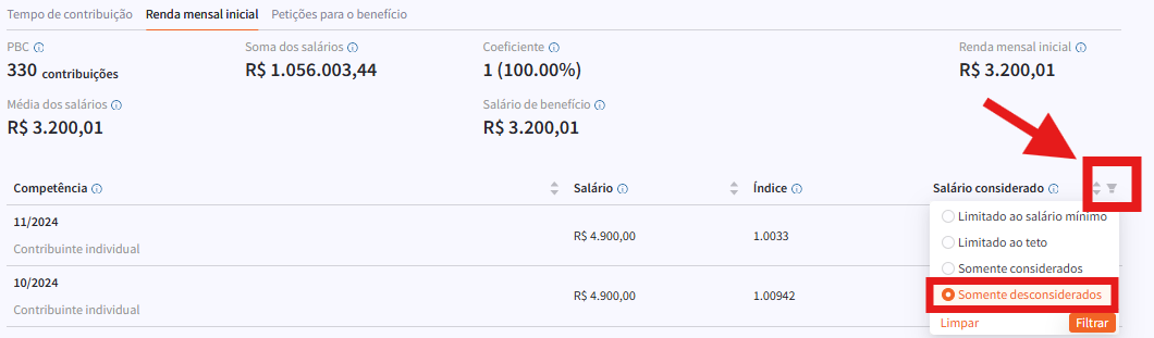 Clique sobre o ícone do funil, no canto direito da tela, ao lado de "salário considerado". Em seguida, selecione "somente desconsiderados" e clique em "Filtrar":