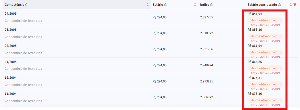 Os benefícios que tiveram a regra aplicada aparecem com a descrição: Regra dos Descartes.