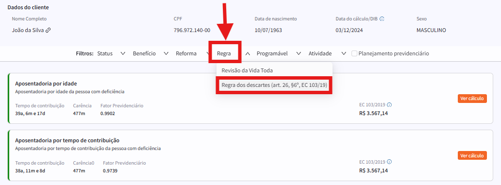 Após realizar os ajustes necessários e clicar em "Calcular", o sistema verificará sozinho em quais benefícios é possível aplicar a Regra dos Descartes.