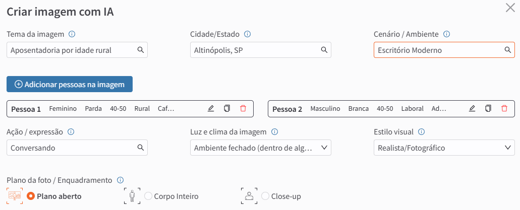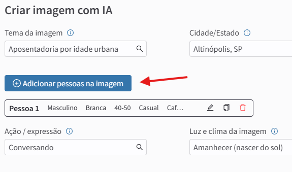 Para adicionar pessoas a uma imagem basta clicar em "Adicionar pessoas na imagem". Você pode adicionar uma ou várias pessoas. Para algumas ações como, especialmente, "conversando", pode ser útil adicionar ao menos duas pessoas na imagem.