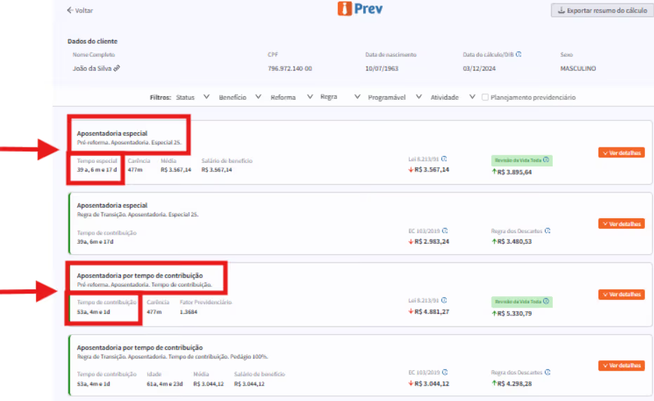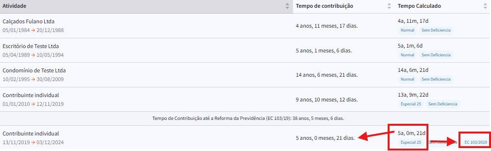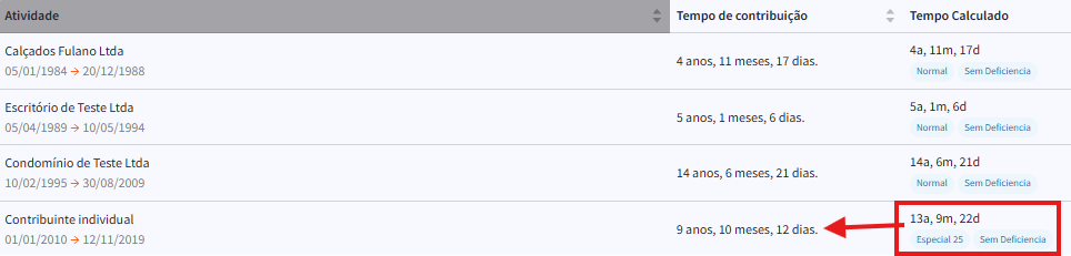 Assim, o tempo de atividade especial convertido será exibido na coluna "Tempo Calculado", junto ao relatório de Tempo de Contribuição:
