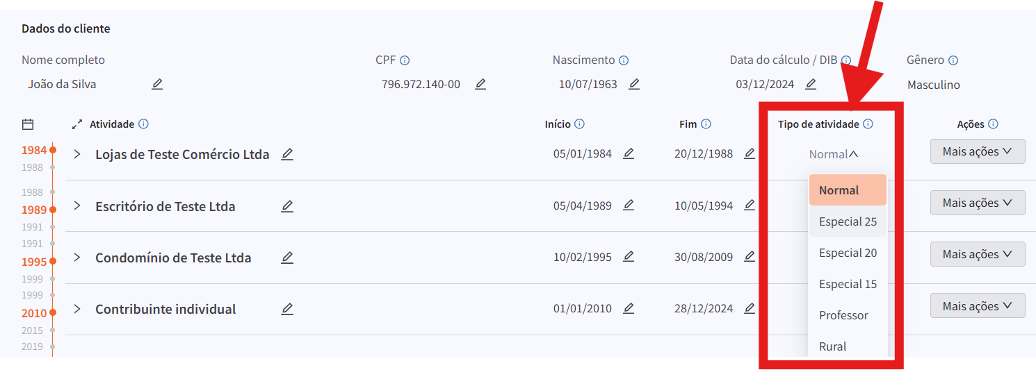 Para que o sistema calcule a Aposentadoria Especial e demais possibilidades de atividades desempenhadas com agentes nocivos à saúde e/ou integridade física do segurado, é necessário que os vínculos de atividades especiais sejam classificados como tal, na opção "TIPO DE ATIVIDADE":