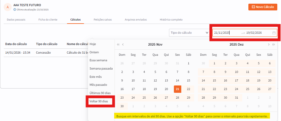 Caso não seja exibido na tela inicial do cliente o cálculo desejado, basta clicar em "VOLTAR 90 DIAS" para ir retrocedendo os intervalos, até a localização do cálculo desejado: