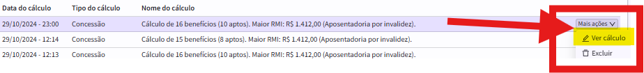 Localizado o cálculo desejado, selecione-o clicando em MAIS AÇÕES > VER CÁLCULO: