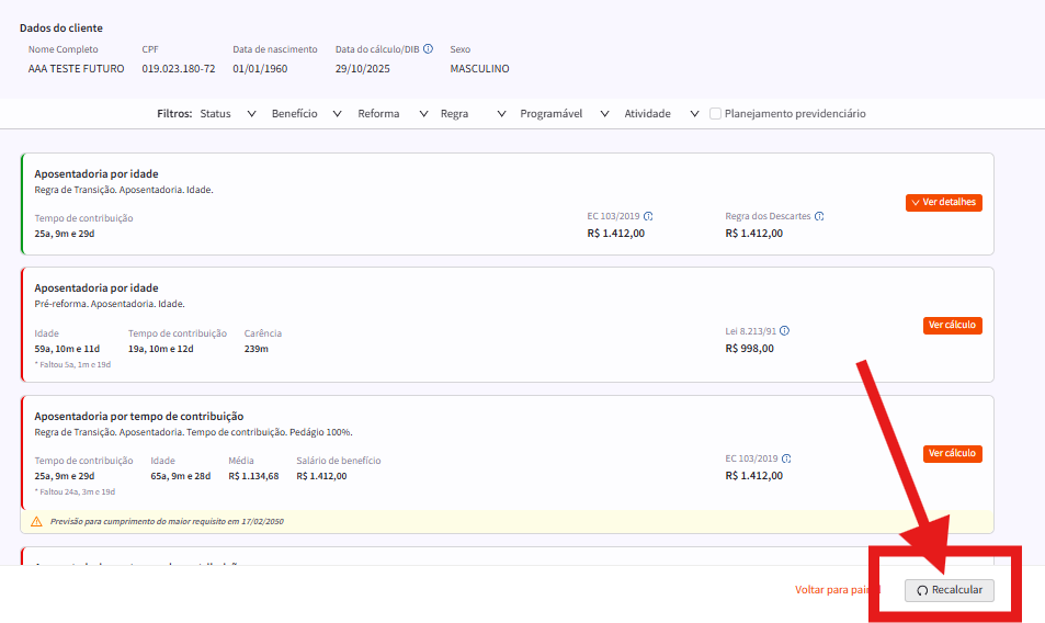 Para editar os vínculos, salários de contribuição, bem como outras informações desejadas no cálculo, basta clicar em "RECALCULAR", no canto inferior direito da tela: