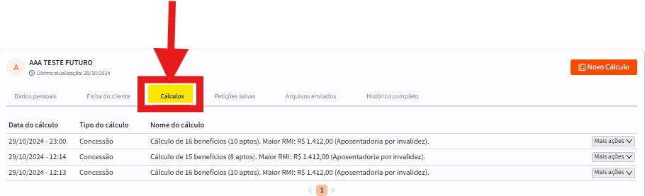 Na tela individual do cliente, clique na aba "Cálculos":